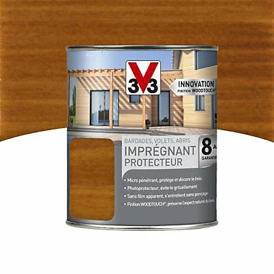 Cette lasure V33 à la teinte mélèze mat protège durablement le bois en extérieur et préserve son aspect naturel.
