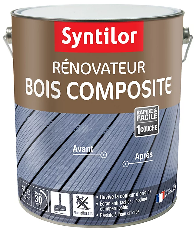 Le Rénovateur Bois Composite Syntilor est spécialement conçu pour tous les bois composites verticaux et horizontaux exposés depuis plus de 6 mois à l’extérieur. Il ravive leur couleur et atténue l’aspect éclairci, blanchi ou terni généré par les intempéries, les UV et les passages répétés.