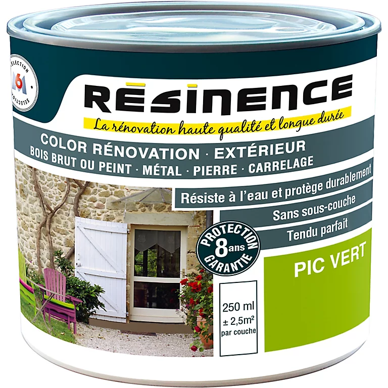 Découvrez la peinture rénovation multi-supports couleur pic vert aspect satin de la marque Résinence. Elle affiche une contenance de 0,25 litres.