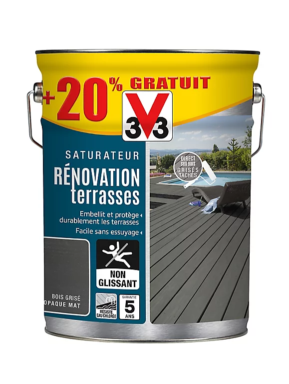 Rénover et embellir facilement et durablement les bois extérieurs avec un seul et même produit : Rénovateur terrasses et bardages Bois Grisé mat 5L + 20% gratuit.
