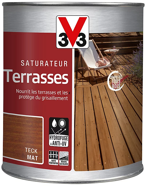 Ce saturateur incolore V33 imperméabilise et protège les bois exotiques et autoclavés en extérieur. Sa formule marine lui octroie plus de résistance à l’eau chlorée et aux UV, tout en bloquant l’eau en surface (effet perlant). Il constitue une protection anti-tâches et anti-graisses. Il préserve donc durablement tous les bois blancs ou exotiques des terrasses & balcons contre les intempéries et les agressions du quotidien.