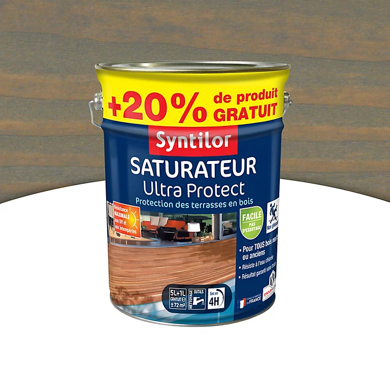 Ce saturateur Ultra Protect de couleur gris mat apporte protection et décoration à votre terrasse : Pour tous bois neufs ou anciens, bois exotiques, bois européens (durs, résineux ou tendres) et bois autoclavés. Il résiste aux UV, intempéries, eaux chlorées, eaux salées, passages répétés, tâches et graisse. Résultat garanti sans trace et sans écaillement.