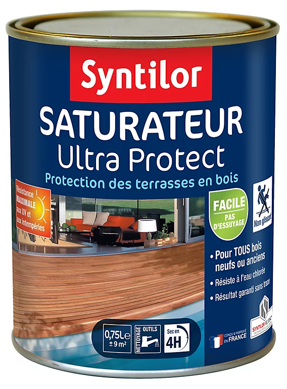 Ce saturateur Ultra Protect de Syntilor, spécialement conçu pour les terrasses et les abords de piscine en bois, est idéal pour protéger durablement vos revêtements de sols. naturel, sans odeur et d’un aspect naturel, ce saturateur, très facile à appliquer, sèche en quelques heures seulement